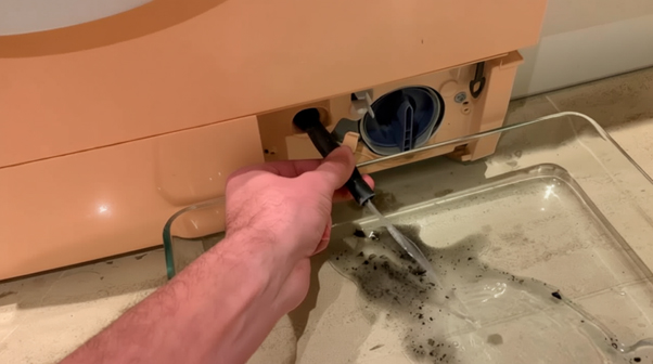 Если вода осталась в барабане, обесточьте машину, откройте лючок сливного фильтра, подставьте емкость и открутите фильтр для слива. Проверьте аварийный шланг, если фильтр не помог.