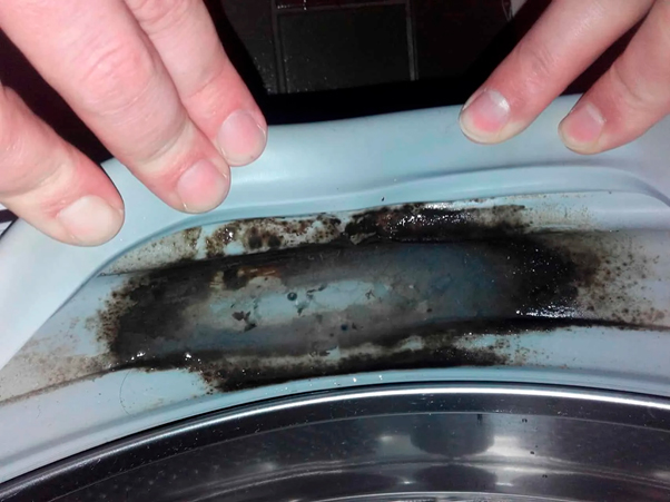 Черная плесень проявляется темными пятнами, пушистыми волокнами или мелкими точками на поверхностях. Она заметна на уплотнительной резинке дверцы, в отсеке для порошка, на сливном фильтре, шлангах или внутренних стенках барабана. Характерный запах плесени сохраняется даже после стирки с порошком или кондиционером. Плесень отличается от грязи хаотичным расположением пятен и специфическим запахом.